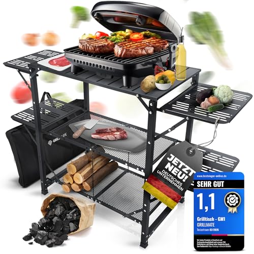 IDEAL Unter der Arbeitsfläche des Grilltischs befindet sich eine praktische, ausziehbare Gitter Schublade, die großzügigen Stauraum für Grillutensilien bietet. Dem Lieferumfang liegen zwei Griffe bei, die nach Belieben an der Vorder- oder Rückseite montiert werden können, sodass der Wagen flexibel und mühelos an jedem gewünschten Ort platziert werden kann.